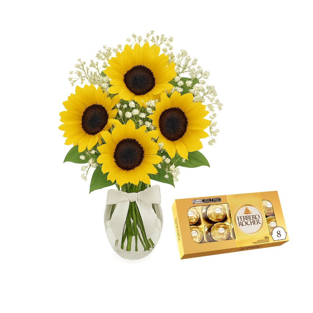 Ilumine o dia de alguém especial com o radiante "Arranjo de Girassol com Ferrero Rocher". Este arranjo combina a alegria e vitalidade dos girassóis com a sofisticação e o sabor irresistível dos chocolates Ferrero Rocher. Os girassóis, que simbolizam felicidade e energia positiva, junto com os chocolates finos e crocantes, criam uma experiência que encanta tanto visualmente quanto pelo paladar. Perfeito para celebrar momentos especiais, agradecer ou simplesmente surpreender quem você ama. Este presente único é a maneira ideal de transmitir seus sentimentos com estilo e doçura.