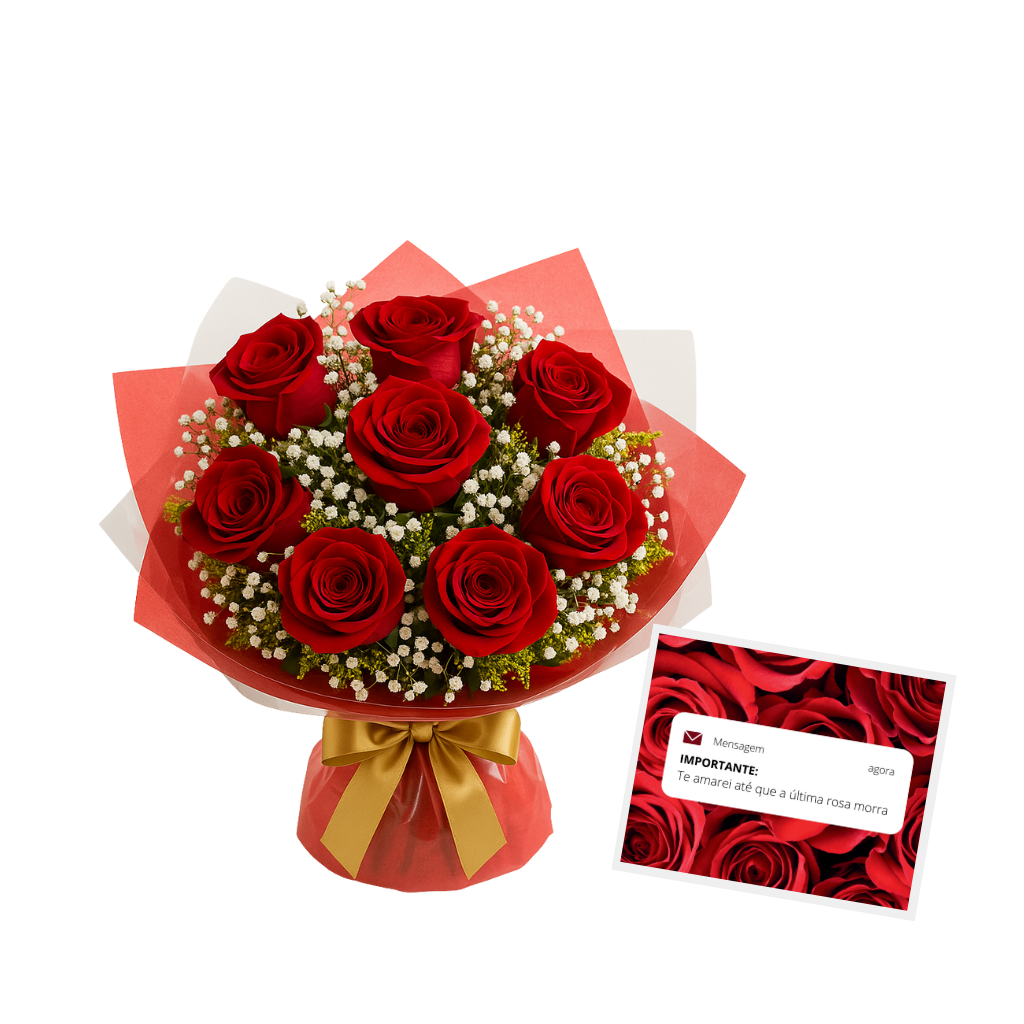 Um gesto eterno de amor: o Buquê “Te Amarei Até a Última Rosa” traz 8 rosas vermelhas intensas, sendo a última rosa acompanhada de um toque especial que simboliza a promessa de um amor duradouro. Ideal para impressionar em momentos únicos e emocionantes. Entrega rápida em Mogi das Cruzes e região.
