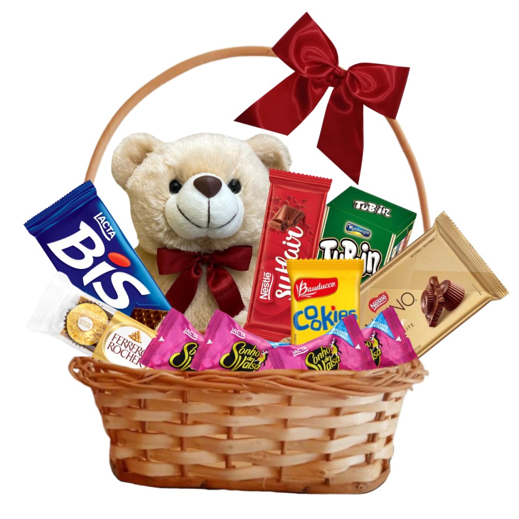 Uma linda cesta de chocolates acompanhada de um ursinho de pelúcia, contendo os seguintes itens:
